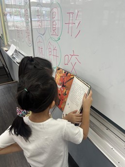 比賽後,老師會將整課生字完整呈現在白板上,邀請學生到閱讀區尋找這些字。孩子們在繪本、故事書中發現熟悉的生字時,常會興奮地喊出「我找到了!」。這樣的活動不僅加深記憶,更幫助他們理解字的意義與用法,體會文字在生活中的存在。