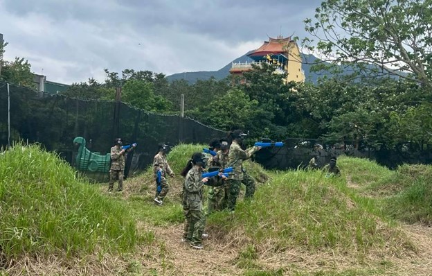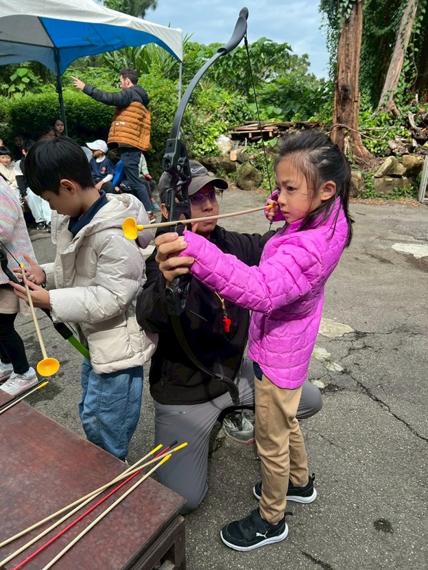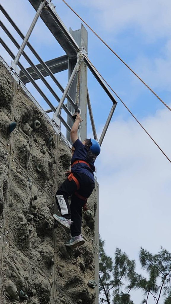 上午活動時間,學生依照年級進行不同強度的冒險課程。低年級學生從基礎闖關與團隊合作遊戲開始,逐步建立信心;高年級學生則投入攀岩、射箭、繩網挑戰、迷你漆彈等更高強度的項目。彈性分組讓每位學生都能真正享受冒險的刺激,並在自我突破後擁有成就感。